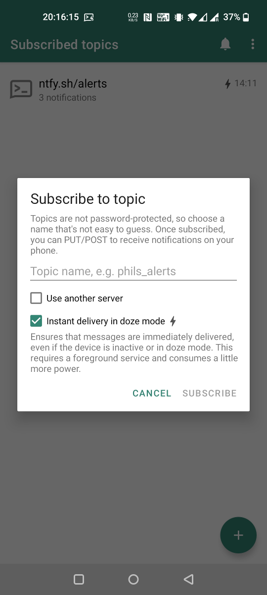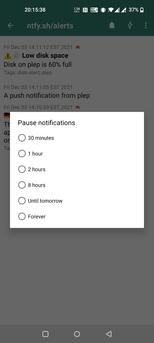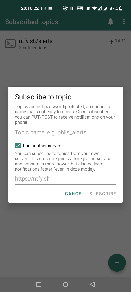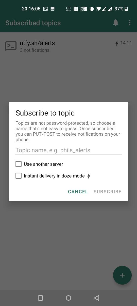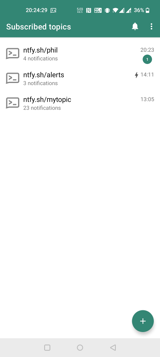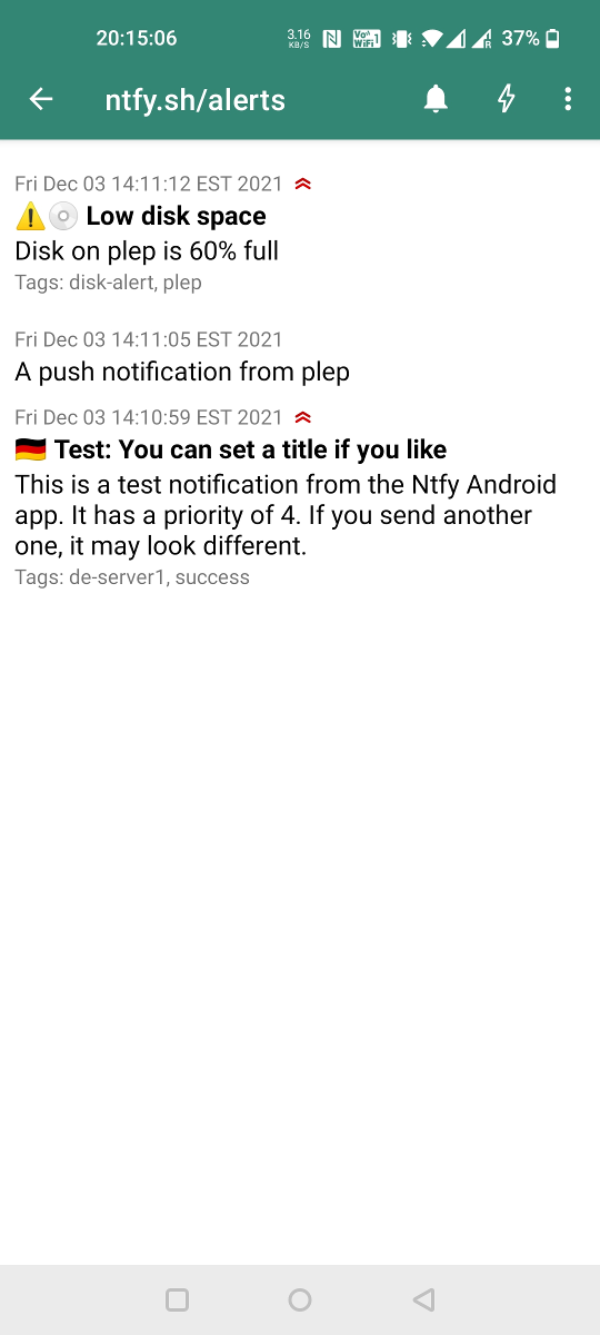 You can use the ntfy Android App or iOS app to receive notifications directly on your phone. Just like the server, this app is also open source, and the code is available on GitHub (Android, iOS). Feel free to contribute, or build your own.
