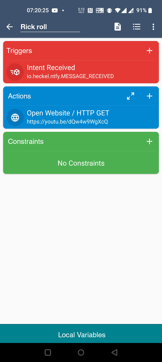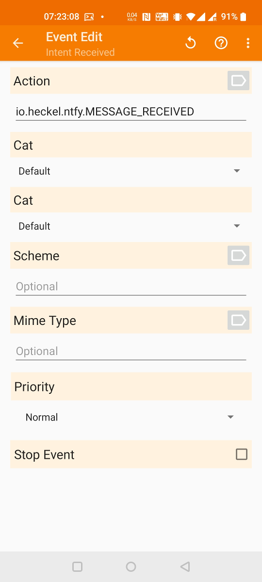 For MacroDroid, be sure to type in the package name io.heckel.ntfy, otherwise intents may be silently swallowed. If you're using topics to drive automation, you'll likely want to mute the topic in the ntfy app. This will prevent notification popups: