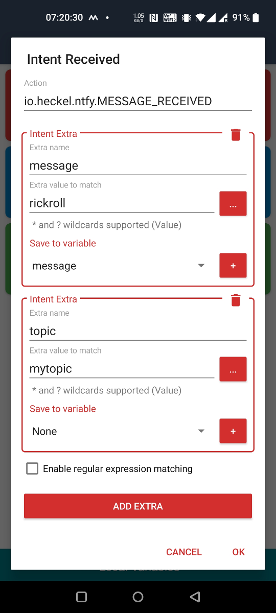 The following intent extras are supported when for the intent with the io.heckel.ntfy.SEND_MESSAGE action:
