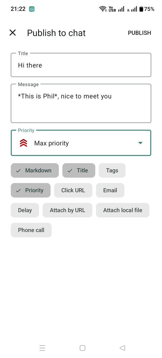 For more options, tap the expand button next to the send button to open the full publish dialog. The dialog lets you compose a full notification with all available options, including title, tags, priority, click URL, email forwarding, delayed delivery, attachments, Markdown formatting, and phone calls.