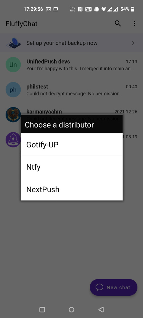 To use ntfy as a distributor, simply select it in one of the supported apps. That's it. It's a one-step installation 😀. If desired, you can select your own selfhosted ntfy server to handle messages. Here's an example with FluffyChat: